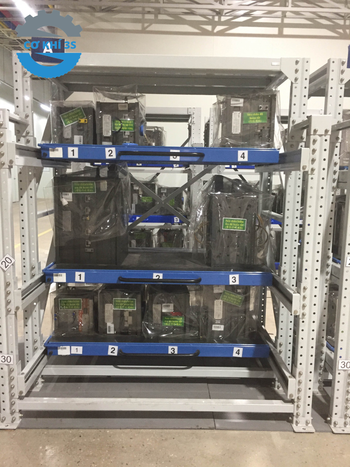- Kệ có khay trượt: Kệ khuôn đều có khay trượt hoặc ngăn kéo, cho phép người dùng có thể xuất hoặc nhập các khuôn nhanh chóng và an toàn.