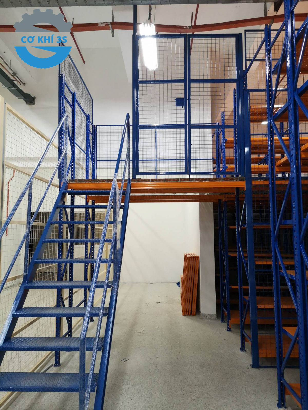 Hệ thống sàn mezzanine cho phép sử dụng cầu thang bộ hoặc xe nâng, vận thang để tiện xếp dỡ hàng và di chuyển giữa các tầng hàng. Phù hợp với các kho chứa có mật độ hàng hóa lớn nhưng không gian hạn chế.