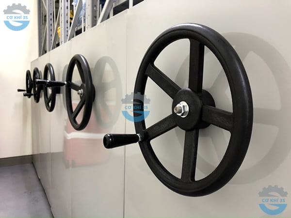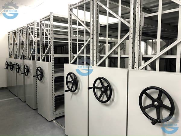 - Tủ hồ sơ di động có bộ điều khiển chuyển động bằng hệ thống ăn khớp bánh răng khi tác dụng vào tay quay trên mỗi khoang.