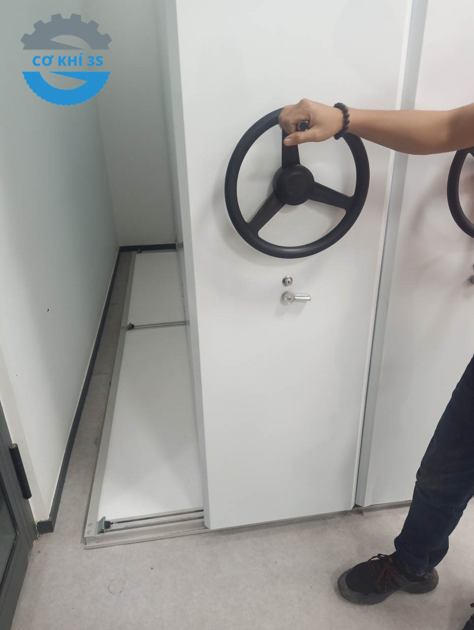 - Kích hoạt cơ chế di chuyển: Người dùng sử dụng bảng điều khiển hoặc tay quay để di chuyển các kệ ra xa nhau, tạo ra một lối đi rộng đủ để xe nâng hoặc nhân viên có thể tiếp cận.