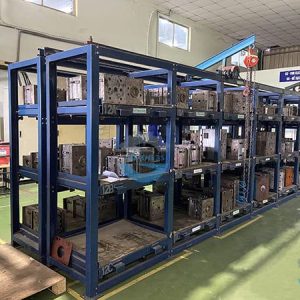 Kt : D1000 x R715 x C2100 mm - Chân cột U60x80x3mm - 3 sàn để khuôn tôn tấm dày 1,5mm lồng hộp tăng cứng xung quanh sàn 40x80x1.5mm. - Ray dẫn hướng 75x40x4mm Sàn có bi chịu lực và chốt an toàn, kết cấu cố định - Cẩu khuôn bằng Pa lăng xích kéo tay 1 tấn Tải trọng 1000kg/tầngGiá chứa khuôn có cẩu móc 3 sàn tải 1000kg