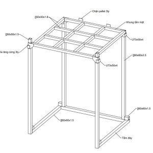 hộp 50x50x1.8mm có 2 tấm bản mã D1400xR385x1m - Khung rời có khả năng cài móc liên kết các pallet lại.